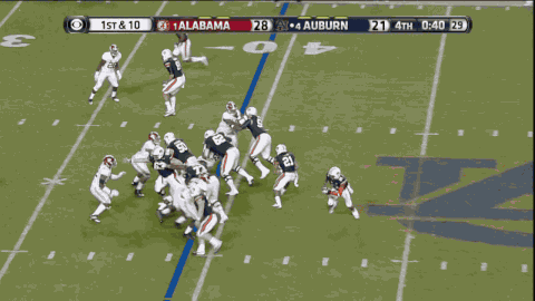 Never before had an end of season rivalry game, with its history and hate already embedded into it, have so much riding on it, on a national stage. Alabama had cruised into Jordan- Hare Stadium on an 11-0 record, crushing the competition with hopes of a 3rd national title as in as many years. Auburn, while hoping to keep its miraculous season going, was projected as the underdog, at home by 10 ½ points, with most of the country picking Alabama to go in and win and preserve their undefeated season. However, once the game began, point spreads and predictions fell to the wayside as two collegiate heavy weights started trading blows as there were multiple lead changes. The game remained tight and tied going into the 4th quarter before Crimson Tide senior quarterback, A.J. McCarron, threw a 99 yard TD pass, the longest play in Alabama history, to super star wide receiver, Amari Cooper, to go up 28-21.